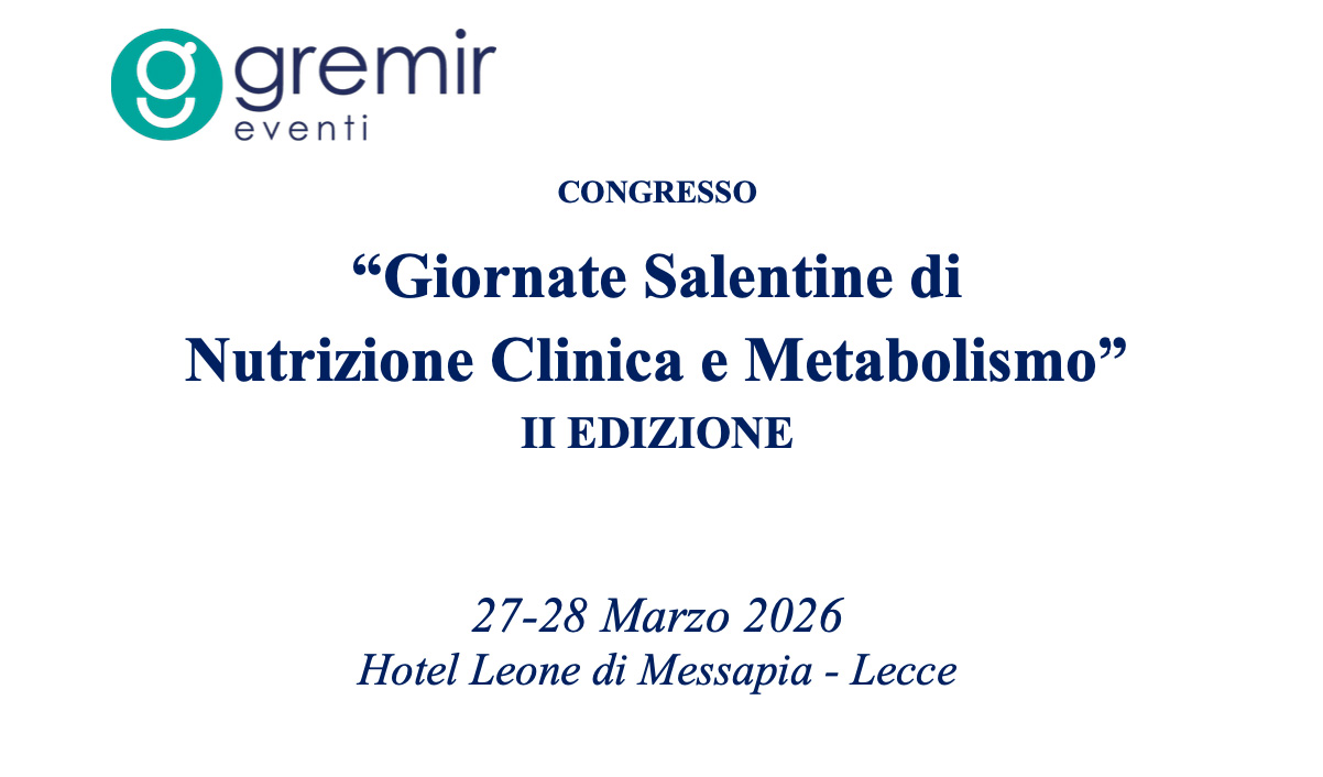 Home Patrocinati SIO Giornate Salentine di Nutrizione Clinica e Metabolismo Giornate Salentine di Nutrizione Clinica e Metabolismo SCARICA IL PROGRAMMA + Aggiungi a Google Calendar + iCal / Outlook export Data Mar 27 - 28 2026 Expired! Ora All Day Luogo Hotel Leone di Messapia - Lecce Categoria Patrocinati SIO Organizzatore GREMIR EVENTI SRL Telefono 349 638 9913 Email amministrazione@gremireventi.it Sito web https://gremireventi.it Condividi questo evento