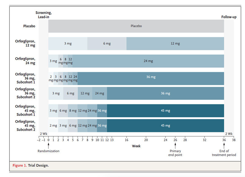 In questo studio di fase 2, randomizzato, in doppio cieco, sono stati arruolati adulti con obesità o con sovrappeso più almeno una condizione coesistente correlata al peso e senza diabete. I partecipanti sono stati assegnati in modo casuale a ricevere orforglipron in una delle quattro dosi (12, 24, 36 o 45 mg) o placebo una volta al giorno per 36 settimane (Figura 1). La variazione percentuale rispetto al basale del peso corporeo è stata valutata alla settimana 26 (endpoint primario) e alla settimana 36 (endpoint secondario).