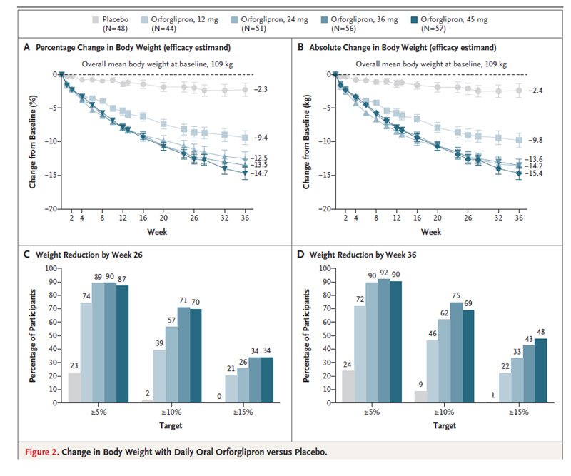 Un totale di 272 partecipanti è stato sottoposto a randomizzazione. Al basale, il peso corporeo medio era di 108,7 kg e l’indice di massa corporea medio (Kg/m2) era 37,9. Alla settimana 26, la variazione media del peso corporeo rispetto al basale variava da -8,6% a -12,6% nelle coorti trattate con orforglipron ed era -2,0% nel gruppo placebo (Figura 2). Alla settimana 36, la variazione media variava da -9,4% a -14,7% con orforglipron ed era -2,3% con placebo (Figura 2). Una riduzione di peso di almeno il 10% entro la settimana 36 si è verificata nel 46-75% dei casi, nei partecipanti che hanno ricevuto orforglipron, rispetto al 9% che ha ricevuto il placebo. L’uso di orforglipron ha portato a un miglioramento di tutti i parametri cardiometabolici e le condizioni correlate al peso prespecificate (ipertensione, dislipidemia, malattie cardiovascolari o sindrome ostruttiva delle apnee notturne). Gli eventi avversi più comuni riportati con orforglipron sono stati eventi gastrointestinali, di entità da lieve a moderata e principalmente durante l’incremento della dose, e ha portato all’interruzione di orforglipron nel 10-17% dei partecipanti nelle coorti di dosaggio. Il profilo di sicurezza di orforglipron è risultato coerente con quello della classe degli agonisti del recettore GLP-1.